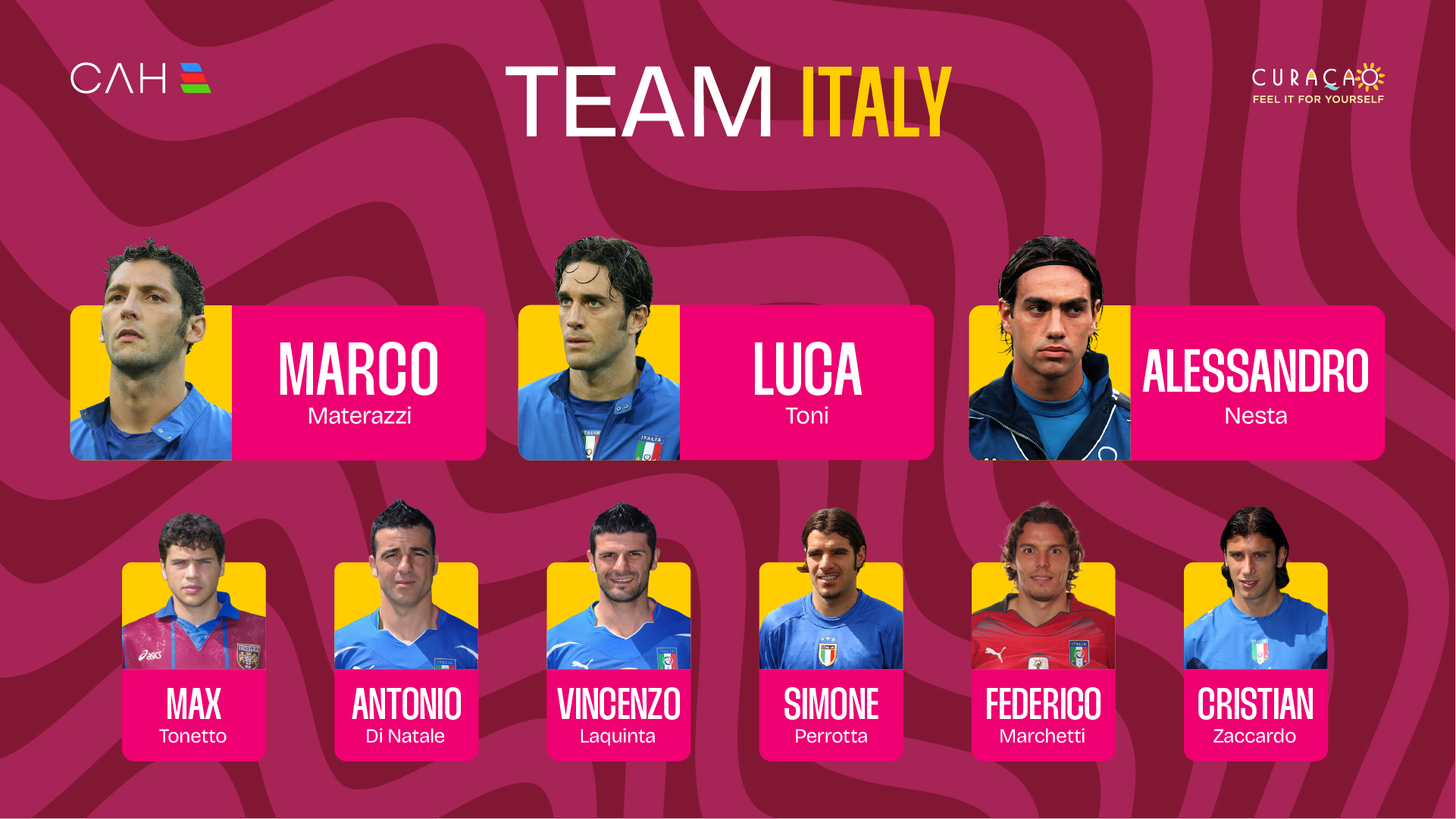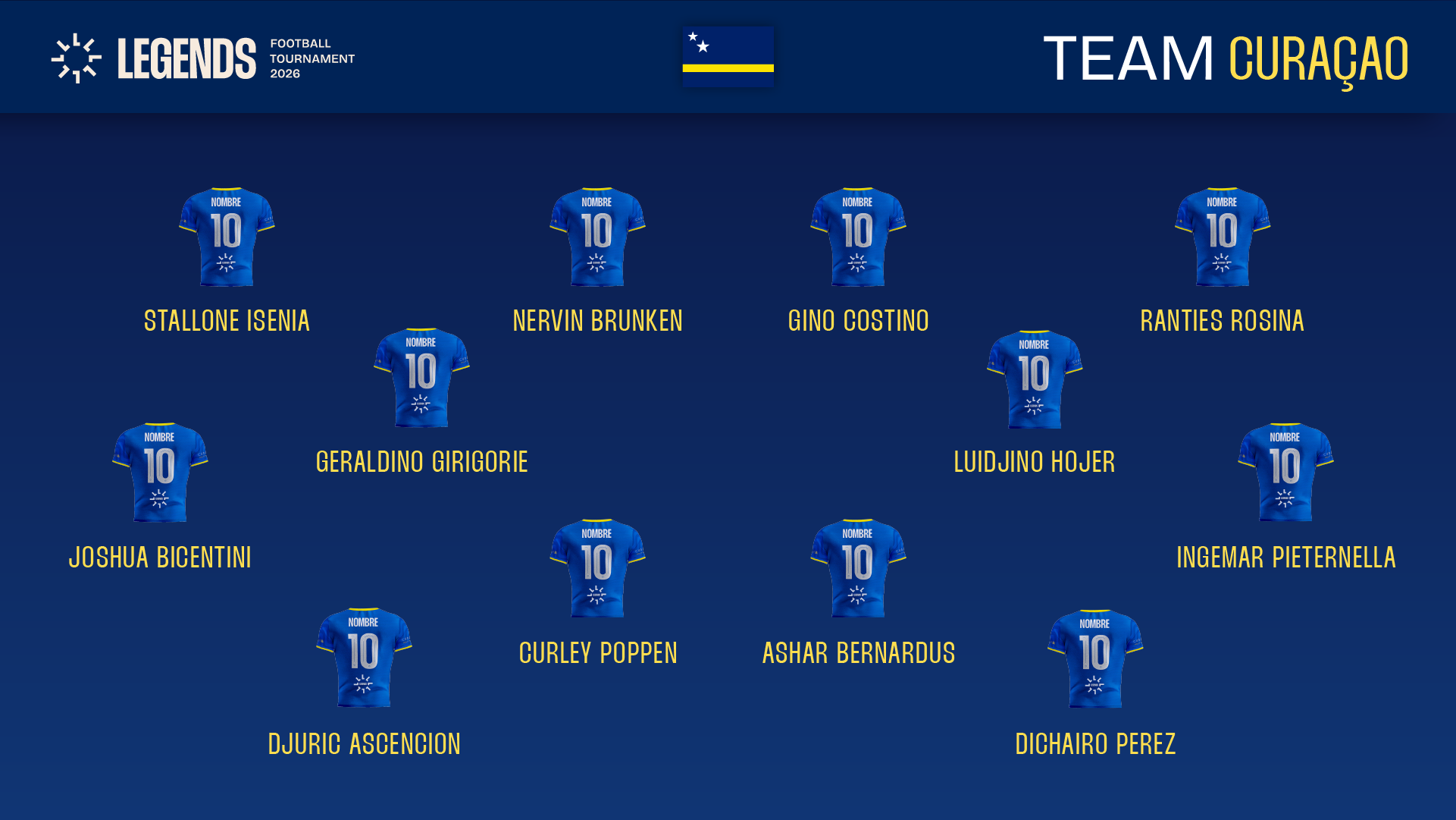 Equipes 9 – 10 de Abril de 2026 Compre seus ingressos online Conheça as equipes Seja bem-vindo ao Torneio de Lendas do Futebol de Curaçao. Abaixo encontrará as equipes participantes. Team Argentina Team Brasil Team Spain Team THE Netherlands Team Colombia Team Italy Team Portugal Team Curaçao